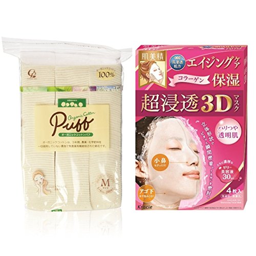 A set of ORGANIC Cotton Makeup Puff, Medium + Hadabisei Kracie Facial Mask 3D Aging Moisturizer Best selling in Japan!