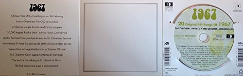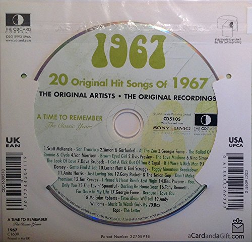 -. Binding : Office Product -. Brand : A Time To Remember -. EAN : 0615858200382 -. Feature : 20 Hits Of 1967 The Classic Years, 1. Scott McKenzie - San Francisco. 2. Simon & Garfunkel - At The Zoo. 3. Georgie Fame - The Ballad Of Bonnie & Clyde. 4. Van Morrison - Brown Eyed Girl. 5. Elivs Presley - The Love Machine. / 6. Nina Simone - The Look Of Love. 7. Dave Brubeck - I Get A Kick Out Of You. 8. Topol - If I Were A Rich Man. 9. Lee Dorsey - Gotta Find A Job. 10. Lester Flatt & Earl Scrs - Foggy Mountain Breakdown. 11. Anita Harris - Just Loving You. / 12. Gary Puckett & The Union Gap - Don't Make Promises. 13. Jim Reeves - I Heard A Heart Break Last Night. 14. Rita Pavone - You, Only You. 15. The Lovin' Spoonful - Darling Be Home Soon. 16. Tony Bennett - For Once In My Life. / 17. Georgie Fame - Because I Love You. 18. Malcolm Roberts - Time Alone Will Tell. 19. Andy Williams - Music To Watch Girls By. 20. Box Tops - The Letter / This unique, deluxe greeting card features fabulous iconic imagery along with news headlines and facts from 1961. -. Label : The CD Card Company -. LegalDisclaimer : Brand New!/factory sealed/direct from the studios/quick service/fast shipping//ships from Chicago -. Manufacturer : The CD Card Company -. Model : C1609 -. MPN : C1609 -. PackageQuantity : 1 -. PartNumber : C1609 -. ProductGroup : Single Detail Page Misc -. ProductTypeName : OFFICE_PRODUCTS -. Publisher : The CD Card Company -. Studio : The CD Card Company -. Title : CDCard Company 1967 - The Classic Years CD - Birthday Card CDC1609510 -. UPC : 615858200382