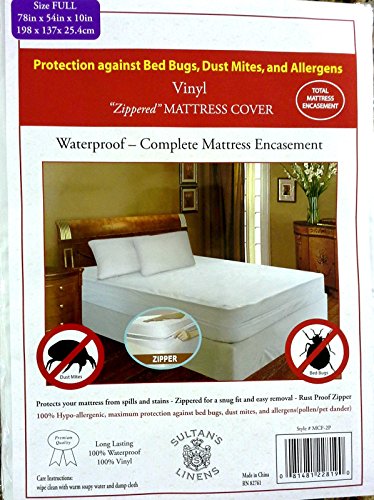 -. Brand : Mattress Protectors -. Color : White -. Feature : Deep Pocket Construction - Fits Mattresses up to 10 inches deep. 100% Hypo Allergenic / Protection against bed bugs, dust mites, and allergans (Pollen/Pet Dander) and Bacteria. Rust Proof Zipper / Protects your mattress from spills and stains. Zippered for a snug fit and easy removal. Tear resistant. Long lasting. Keeps Mattress fresh and clean / Wipe Clean with warm soapy water and damp cloth. Material: 100% Waterproof Vinyl. Soft and Durable. -. ProductGroup : Home -. ProductTypeName : HOME_BED_AND_BATH -. Title : Waterproof Vinyl Zippered Mattress Cover All Sizes Bed Bug Allergy Protector