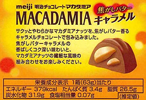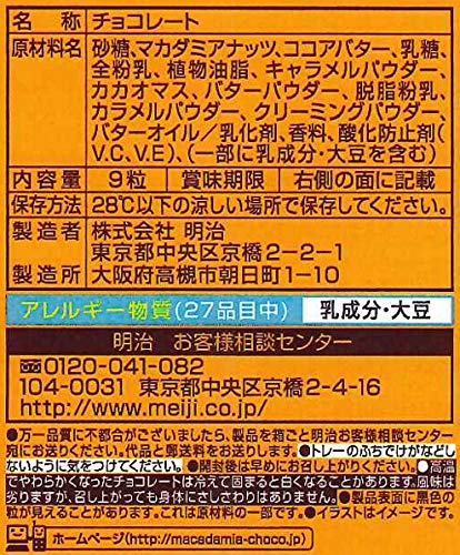 原材料:砂糖、マカダミアナッツ、ココアバター、乳糖、全粉乳、植物油脂、キャラメルパウダー、カカオマス、バターパウダー、脱脂粉乳、カラメルパウダー、クリーミングパウダー、バターオイル、乳化剤、香料、酸化防止剤(V.C、V.E)、(一部に乳成分・大豆を含む)