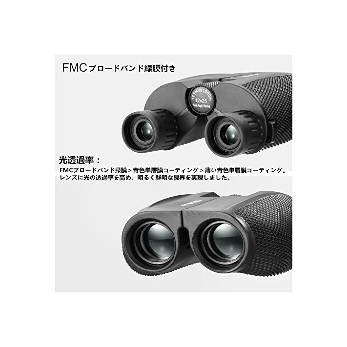 ★【FMC브로드 밴드록 막렌즈를 채용】렌즈에 빛의 투과율을 높이고, 밝게 선명한 시야를 실현 했습니다.스포츠 관전,버드워칭,연극 구경,콘서트,여행 등에 위력을 발휘합니다.주:광투과율:FMC브로드 밴드록막>청색단 층막코팅>얇은 청색단 층막코팅