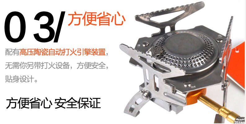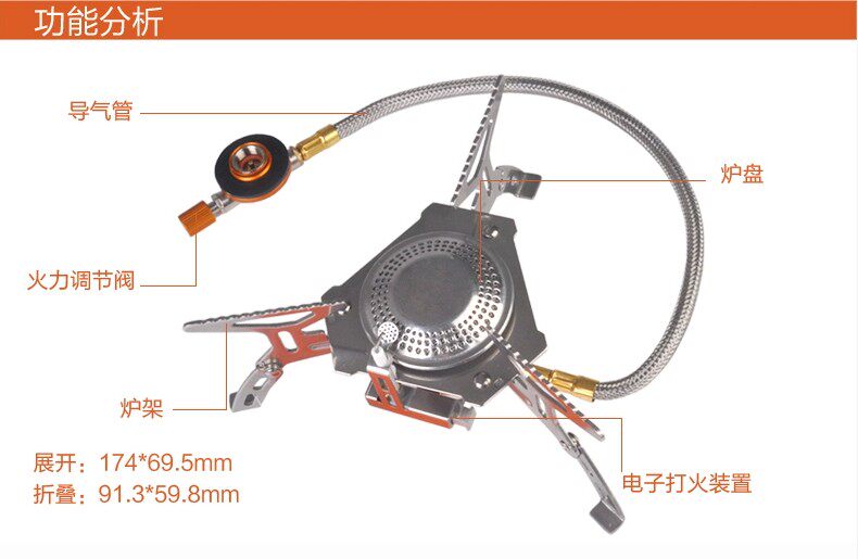 炉盘采用回旋式火焰设计,大小适中,燃烧更加充分,最大程度的节省燃料,最新加装高能量陶瓷压电打火,确保点火便携使用方便。