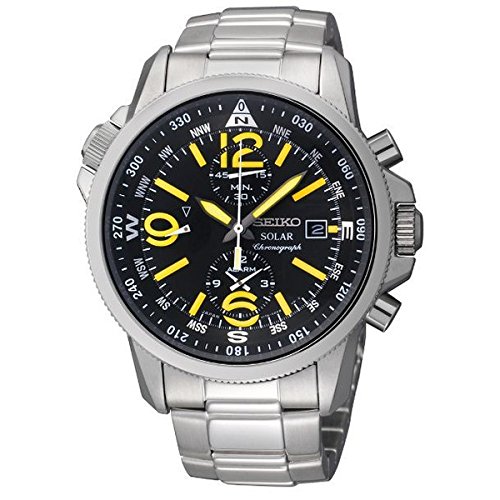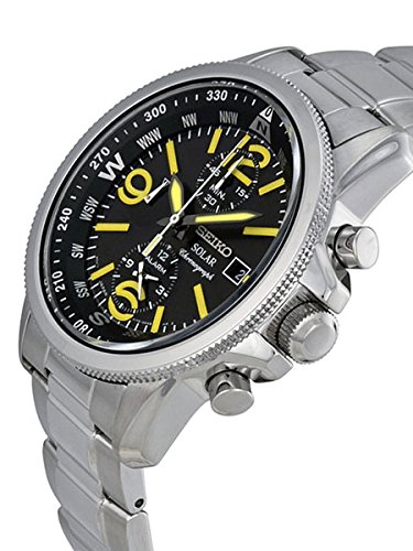 세이코 솔라 크로노그래프 스테인레스 스틸 케이스와 팔찌 블랙 다이얼 맨즈 스테인레스 스틸 케이스 두께13mm에 41mm직경 대책.스테인레스강 링크 팔찌.블랙 다이얼은,노란색의 톤의 손과 시간 마커를 가지는.날짜 표시.CHR.