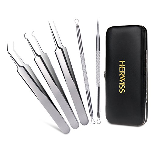 Herwiss Blackhead Remover Tools and Acne Treatment System With Comedones Extractor, Zit Popper, Curved Tweezer Clip Kit for Risk-free Eradication of...