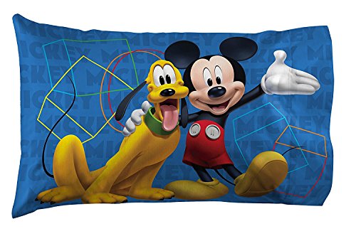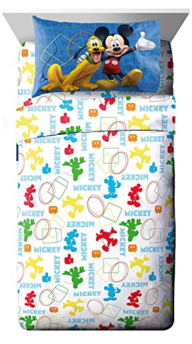 Your little one can hang with Mickey and the gang every night at bedtime! This cute Disney Mickey Mouse Clubhouse 5 Piece Twin Bedding Set is decked out with graphics of everyone's favorite cartoon mouse and his pals Donald Duck, Goofy, and Pluto. The soft cotton blend fabric is comfy and cozy, just right for snuggly slumbers. Contains: One twin/full size comforter measuring 71 x 86 inches (180 x 218 cm). One twin flat bed sheet, finished size 66 x 96 inches (168 x 244 cm). One twin fitted sheet. Both of the above fit a standard twin mattress of 39 x 75 inches (99 x 191 cm). One standard pillowcase finished size 20 x 30 inches (51 x 76 cm) and one standard pillow sham, 20 x 26 inch (51 x 66 cm).Feature