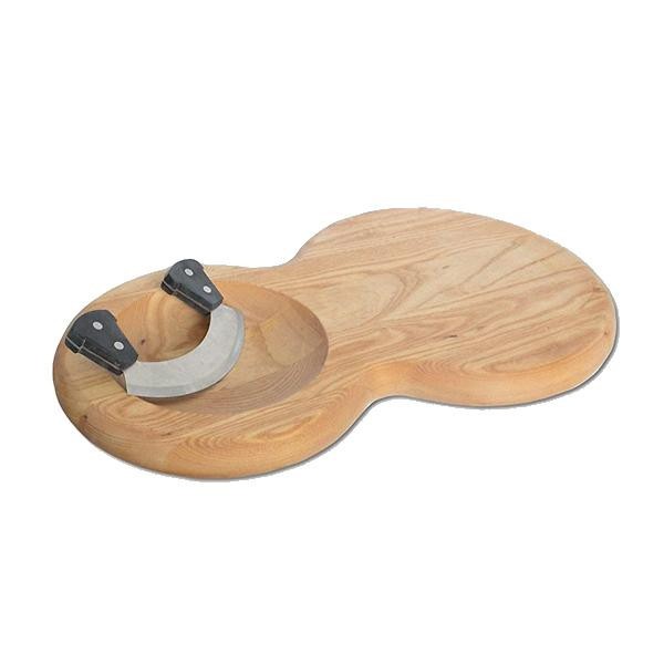 存在感抜群のひょうたん型まな板。専用のメッツァルーナナイフもついたセットです。 |