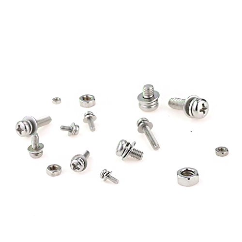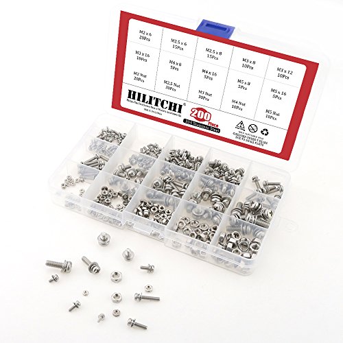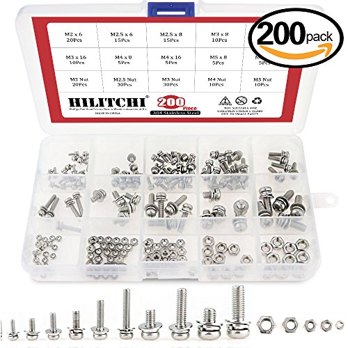 Hilitchi 200pcs M2 M2.5 M3 M4 M5 Phillips Pan Head Screws Nuts w Washers Assortment Kit - 304 Stainless Steel