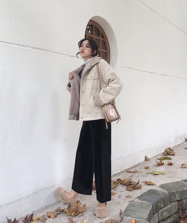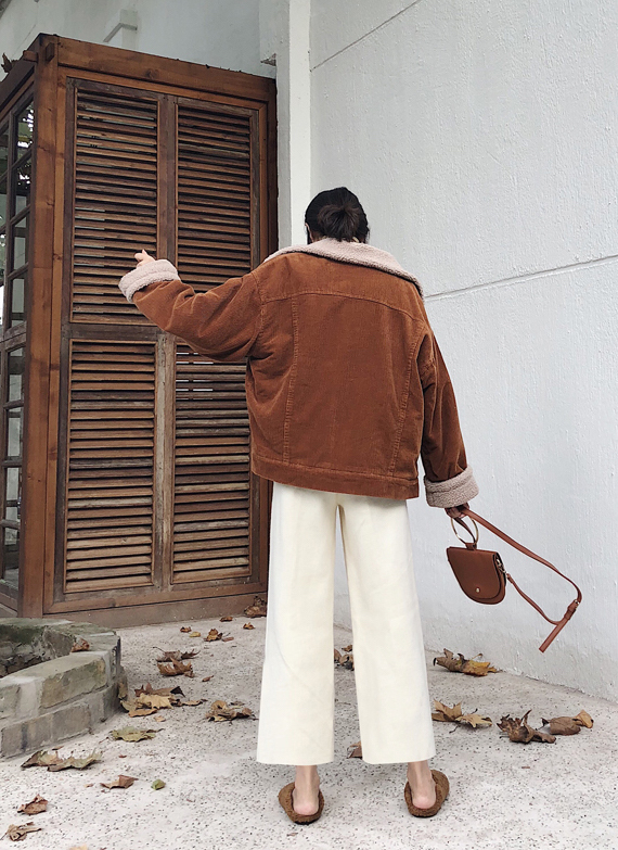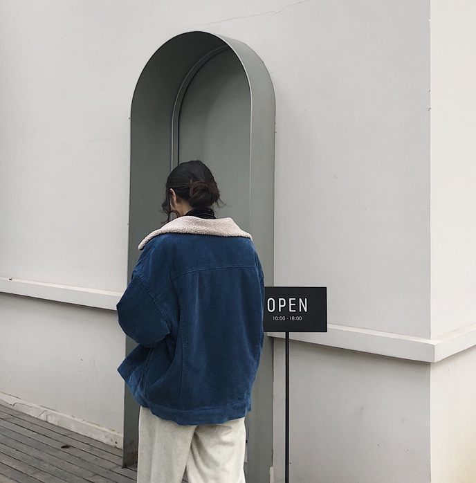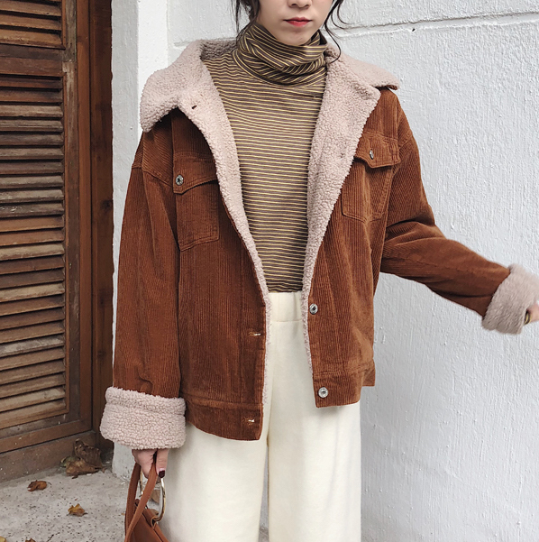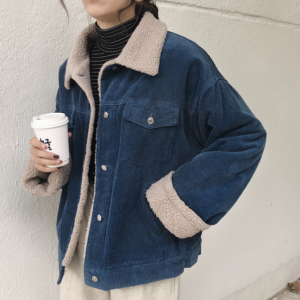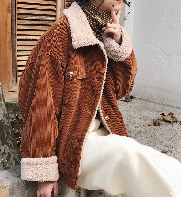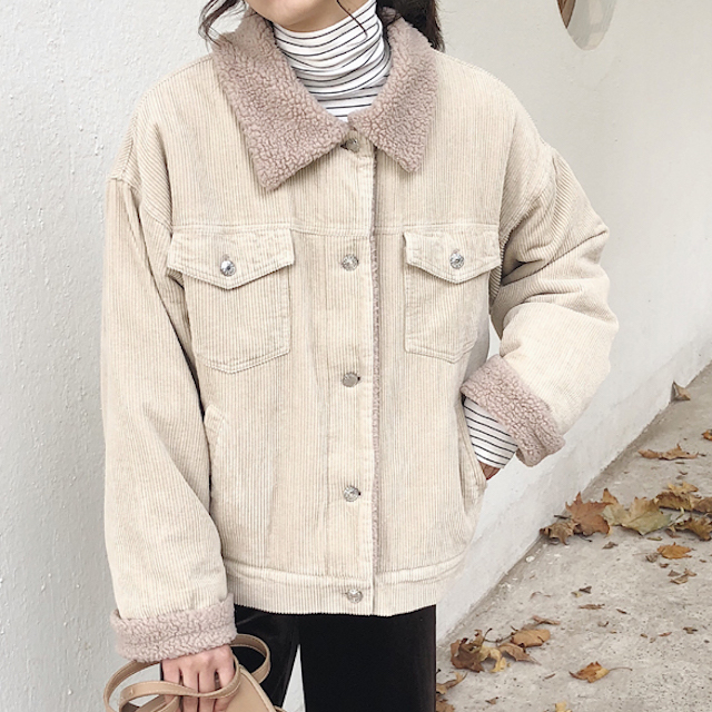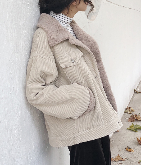 カジュアルながらも女性らしい雰囲気のショート丈コーデュロイジャケットです。