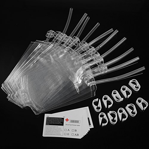 - PChero Blood Bag comes with 10pcs empty bags, 10pcs clips and 10pcs labels per set. The bags are made of Food Grade PVC, more softer than Usual. Every bag has 300cc of capacity, Big Enough Volume that no need to refill in full party.