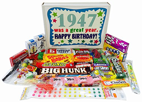 -. Binding : Misc. -. Brand : Woodstock Candy -. Feature : Contains 40 kinds of candy a 70 year old will remember from their youth / Send a unique gift for this special milestone birthday with a stroll down memory lane / Make this day a little sweeter with reminiscing about the different candy and what it meant to them / Comes shrink wrapped in a box that measures 11.75" x 9" x 2" / The candy box reads "1947 was a great year. Happy Birthday!" -. IsAdultProduct : 0 -. Label : Woodstock Candy -. Manufacturer : Woodstock Candy -. PackageQuantity : 1 -. ProductGroup : Grocery -. ProductTypeName : GROCERY -. Publisher : Woodstock Candy -. Studio : Woodstock Candy -. Title : 1947 70th Birthday Gift Box of Retro Nostalgic Candy from Childhood for a 70 Year Old Man or Woman
