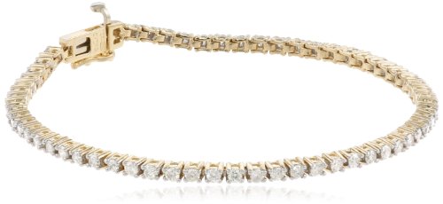 A diamond tennis bracelet is a jewelry wardrobe classic that looks perfect with everything from a casual luncheon outfit to a dressy evening gown. This elegant in-line bracelet is constructed in 10 karat gold and showcases a line of prong-set round diamonds (2 cttw), closely linked for a beautiful drape over the wrist. Choose between white or yellow gold, and select from four possible lengths: 7", 7 1/4", 7 1/2", and 8". The bracelet is finished with a traditional tongue-in-groove clasp and safety latch.Feature