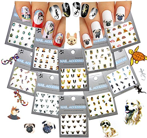 -. Feature : DOGS & GECKOS & TURTLES NAIL TATTOOS - 10 sheets with fun designs in variety of colors and sizes. About 200 tattoos. Dog Breeds include: Pug, Dalmatian, Golden Retriever, Lab, Bulldog, Shiba, Bull Terrier / VERY EASY TO USE - Literally takes 20 seconds per nail. No more complex painting! Easy to use / LONG LASTING - These tattoos will last for weeks or as long as your polish stays on! / INSTRUCTIONS INCLUDED - For application refer to instructions on the back of the package or below / MIX, MATCH AND HARMONIZE - Plenty of designs to choose from. Our tattoos are the wise choice for unique nail decor