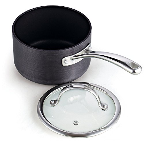 Cooks Standard Hard Anodize Nonstick 8-Piece Cookware Set Black, Set includes 1-QT sauce pan with lid, 2-QT sauce pan with lid, 6-QT stockpot with lid, 9.5-inch and 11-inch sauté/skillet fry pan. Lid is tempered glass that is protected by a stainless steel rim. Ergonomically designed stainless steel handle is riveted for strength. Nonstick delivers exceptional performance and makes cleaning easy. Heavy gauge aluminum core provides even heat distribution without any "hot spots".Feature