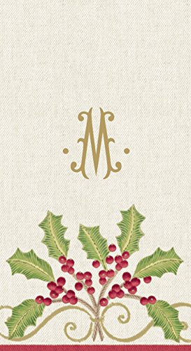 Entertaining with Caspari Christmas Embroidery Paper Linen Guest Towel, Monogrammed M, Box of 24