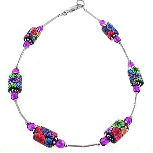 -. Title : Womens Pastel Fimo, Purple Czech Fire Polished Glass & Sterling Silver Ladies Beaded Anklet with Daisies