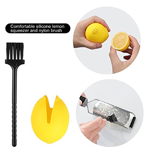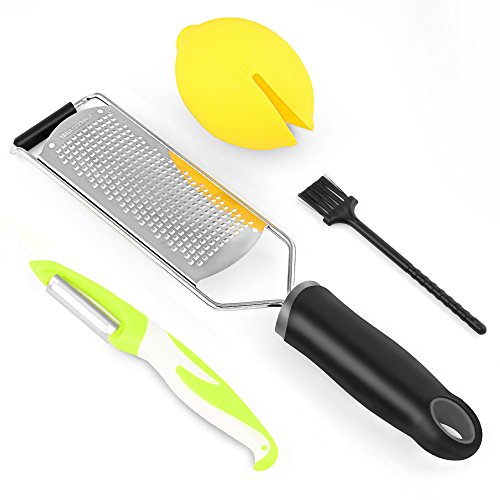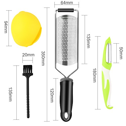 - This 4-piece set includes the cheese zester grater,lemon squeezer,fruit peeler and brush,easily to zest and grade the lemons, limes, oranges & grate parmesan, feta, gouda, cheddar, mozzarella, nutmeg, chocolate, hard boiled egg, carrots, garlic, ginger, nuts and more! Which is economical, environmentally,safe and very easy to use.