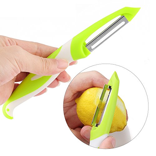 - The peeler has unique handle design lets you grip the peeler with ease, even with wet hands. Dual stainless steel blades stay ultra-sharp so you can peel right the first time. The blades glide along the surface of produce ever so smoothly, allowing you to peel effortlessly.