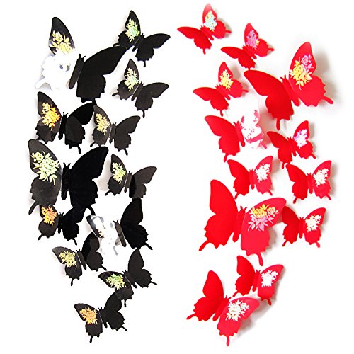 -. Feature : Butterfly Size: 24 pcs red butterfly wall stickers and 24 pcs black butterfly wall stickers (3 different sizes); Package Included: 48 Pcs Butterfly Wall Stickers (doule side tape included) / A little gold flower on the butterfly, unique and beautiful. / The stickers can be applied on all smooth surfaces, such as Walls, Doors,Closets, Plastic, Metal, Tiles, Fridges, Laptops, Cars etc. / Artificial, decorative flowers are perfect for decorating wedding centerpieces and floral arrangements. The flowers are becoming very popular as an enhancement for Holiday decorations, Christmas trees, wreaths, Christmas ornaments and other arts and crafts floral designer creations. / Good decoration gadgets: they can be applied to decor a theme party, butterfly museum embellishment, children room, garden parties, photography background, Christmas, wedding, birthday, etc.