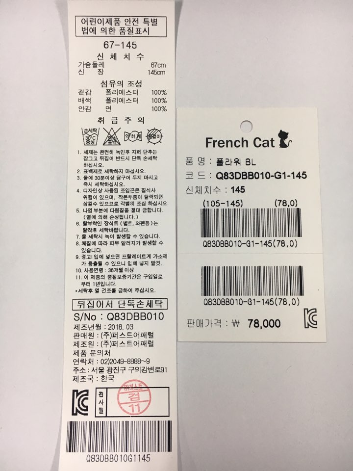 제품소재 : 겉감 폴리에스터 100%배색 폴리에스터 100%안감 면100%