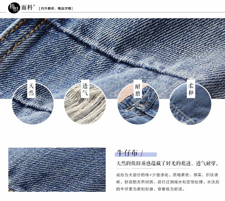 ![]() | 柔和牛仔 采用水洗的后处理工艺,提高面料的手感,紧密耐磨,穿着舒适不紧绷。 |