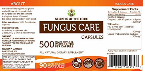 -. Feature : Fungus Care, Organic: Oregano Leaf (Origanum vulgare). Wildcrafted: Pau d'Arco Bark (Tabebuia Impetiginosa), Usnea Thallus (Usnea barbata) / Capsules, 500 mg, Supplement / All Natural Herbal Supplements, GMO FREE, MADE IN USA