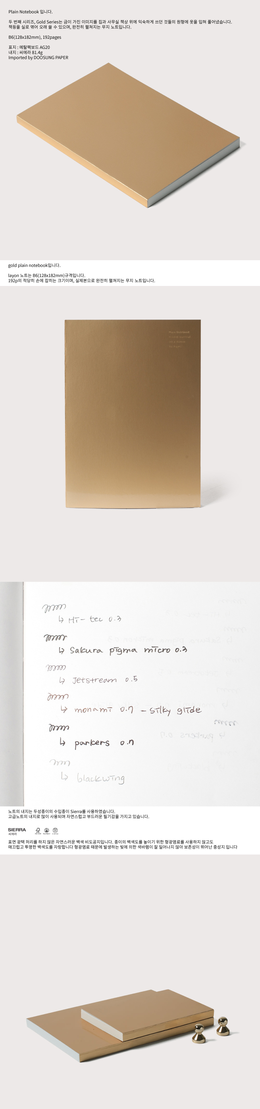 | Gold 365 planner 입니다. 두 번째 시리즈, Gold Series는 금이 가진 이미지를 집과 사무실 책상 위에 익숙하게 쓰던 것들의 원형에 옷을 입혀 풀어냈습니다. 책등을 실로 엮어 오래 쓸 수 있으며, 완전히 펼쳐지는 무지 노트입니다. B6(128x182mm), 192pages 표지 : 메탈팩보드 AG20 내지 : 씨에라 81.4g Imported by DOOSUNG PAPER 노트의 내지는 두성종이의 수입종이 Sierra를 사용하였습니다. 고급노트의 내지로 많이 사용되며 자연스럽고 부드러운 필기감을 가지고 있습니다. Sierra 는 표면 광택 처리를 하지 않은 자연스러운 백색 비도공지입니다. 종이의 백색도를 높이기 위한 형광염료를 사용하지 않고도 매끄럽고 투명한 백색도를 자랑합니다 형광염료 때문에 발생하는 빛에 의한 색바램이 잘 일어나지 않아 보존성이 뛰어난 중성지 입니다 |