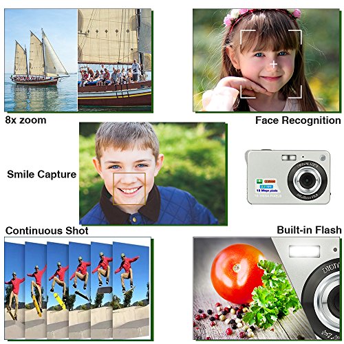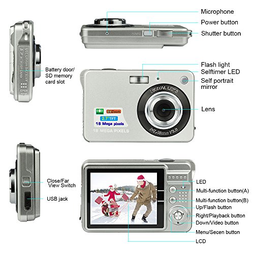 2.7" TFT LCD display with 8x digital zoom,Built in flash; 18MP resolution for good photos and HD 720P resolution for better recording. Language Supports English/Spanish/German/French/Portugese/Italian/Chinese
