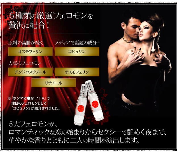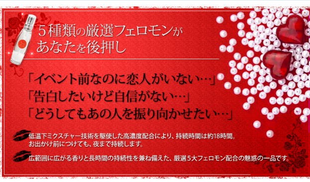 | 使用方法 | ・原液のまま適量を肌や衣服になどに吹き付けてお使い下さい。 ・よりアピールしたい時は、少し多めにプッシュするのがおすすめです。 男女兼用フェロモン香水ですので、どちらもお使いいただけます。 |
