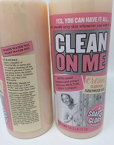Soft, smooth sexy skin whenever you want it, just Clean on Me. With natural mandarin peel extract and bonus built-in body lotion! "Cleanliness is essential when godliness is improbable." Fragranced with Soap & Glory's addictive signature scent and rich creamy texture, we're classifying Soap & Glory Clean On Me Body Wash with 'must-have' status. Apply a handful of Soap & Gory Clean On Me Body Wash to damp skin, rub it into a thick, luxurious lather, and then rinse. Follow with Soap & Glory's The Righteous Body Butter or Easy Glistening Body Softening Spray. Soap & Glory formulas are not tested on animals, only very picky people. Ingredients Aqua (Water/Eau), Sodium Laureth Sulfate, Cocamidopropyl Betaine, Acrylates Copolymer, Parfum (Fragrance), PEG-4 Distearyl Ether, Sodium Chloride, Distearyl Ether, Dipropylene Glycol, Hexyl Cinnamal, Styrene/Acrylates Copolymer, Guar Hydroxypropyltrimonium Chloride, Limonene, Dicaprylyl Ether, Propylene Glycol, Butylphenyl Methylpropional, Linalool, Benzyl Salicylate, Tetrasodium EDTA, Disodium Phosphate, Sodium Hydroxide, Geraniol, Sodium Benzoate, Sodium Citrate, Citric Acid, Methylisothiazolinone, Alpha-Isomethyl Ionone, Citral, Citrus Nobilis (Mandarin Orange) Peel Extract, Sorbitol, CI 15985 (Yellow 6), CI 14700 (Red 4)Feature