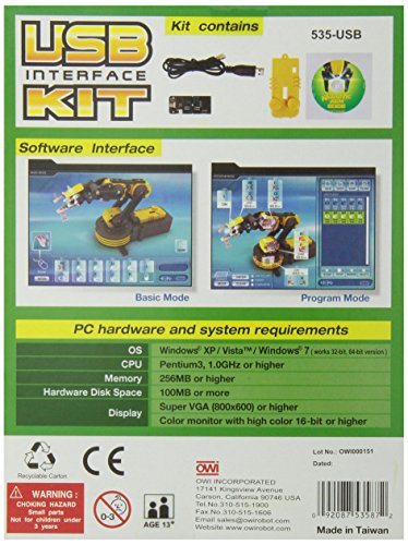 535-USB Features: -USB interface for robotic arm edge. -Connect the robotic arm edge to a windows personal computer USB port. -Allow real time interactive control, plus contains a built-in interactive script writer. -May be saved and loaded from disk just like any other standard computer file. Gender: -Boy. Category: -Construction & Building. Generic Specifications: -May write a script that contains up to 99 individual robotic arm functions into a single script file. Generic Dimensions: -8.25'' H x 2'' W x 6'' D. Dimensions: Overall Height - Top to Bottom: -8.25 Inches. Overall Width - Side to Side: -2 Inches. Overall Depth - Front to Back: -6 Inches. Overall Product Weight: -1 Pounds.; From the Manufacturer; Add OWI USB Interface for Robotic Arm Edge and have real time manual control of the robotic arm and program the arm to perform a sequence of movements. Command the robotic arm gripper to open and close, radial wrist motion of 120 Degree, an extensive elbow of 300 Degree, base rotation of 270 Degree, base motion of 180 Degree, vertical reach of 15 inches, horizontal reach of 12.6 inches and lifting capacity of 100g. Some of the added features include a search light design on the gripper and an audible safety gear indicator is included on all 5 gear boxes to prevent potential injury or gear breakage during operation. Total command and visual manipulation using the "5's", five-switch wired controller, 5 motors, 5 gear boxes, and 5 joints. For ages 10 and up. ROBOTIC ARM NOT INCLUDED.Feature