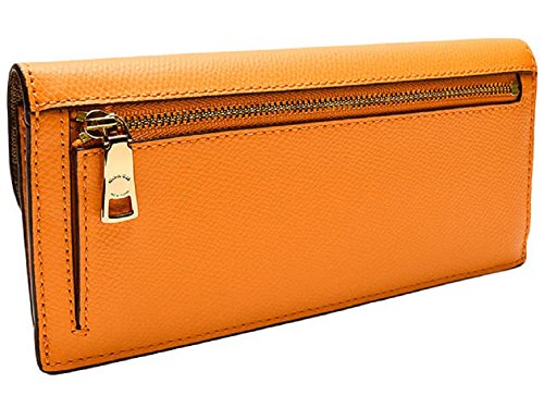 -. Feature : Crossgrain leather in orange peel color / Snap Closure; Polished logo plaque on front / Interior features 8 card slots and full-length billfold compartment / Exterior back features zip compartment / Approx. 7 3/4" (L) x 3 1/2" (H) x 1" (W)