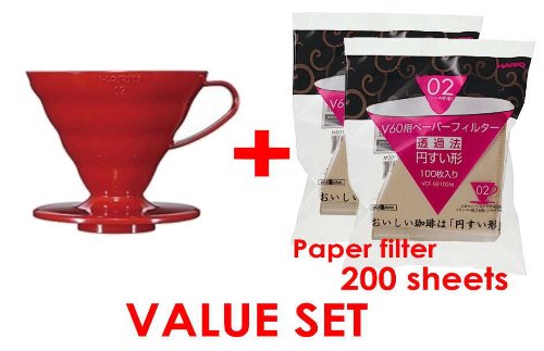 -. Brand : Hario -. Color : Red -. EAN : 4560214922803 -. Feature : Body: AS resin, spoon: Plastic Body & Accessories: V60 measuring spoon with / In Japanese, HARIO means "The King of Glass" / User controls the flow, timing and temperature of the water for better brewing / Made in Japan & Professional experience & Easy to use / The inexpensive starter set for using hario -. Label : Hario Coffee Dripper V60 Size 02 Red & Hario 02 100 Count Coffee Paper Filter, Natural X2 Set(total 200 Sheets)- Starter Value Set (With Our Shop Original Description of Goods) -. Manufacturer : Hario Coffee Dripper V60 Size 02 Red & Hario 02 100 Count Coffee Paper Filter, Natural X2 Set(total 200 Sheets)- Starter Value Set (With Our Shop Original Description of Goods) -. Model : VD-02RVCF-02-100M -. MPN : VD-02RVCF-02-100M -. PartNumber : VD-02RVCF-02-100M -. ProductGroup : Kitchen -. ProductTypeName : KITCHEN -. Publisher : Hario Coffee Dripper V60 Size 02 Red & Hario 02 100 Count Coffee Paper Filter, Natural X2 Set(total 200 Sheets)- Starter Value Set (With Our Shop Original Description of Goods) -. Size : king -. Studio : Hario Coffee Dripper V60 Size 02 Red & Hario 02 100 Count Coffee Paper Filter, Natural X2 Set(total 200 Sheets)- Starter Value Set (With Our Shop Original Description of Goods) -. Title : Hario Coffee Dripper V60 Size 02 Red & Hario 02 100 Count Coffee Paper Filter, Natural X2 Set(total 200 Sheets)- Starter Value Set (With Our Shop Original Description of Goods)