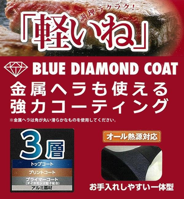 強力3層コーティングのブルーダイヤモンドコートが施してあり丈夫なので、金属ヘラも使えます。お手入れしやすい一体型ハンドル。 |