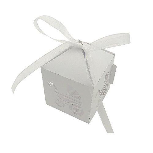 HEMALL 50PCS Laser Cut Favor Boxes, 2x2x2 inch Party Boxes with 50 Ribbons for Baby Shower Favors Baptism Decorations, White, Z1048