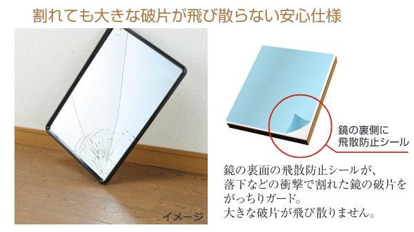 | 地震災害時などのもしもの時に、大きな破片が飛び散りにくいよう鏡裏面に飛散防止シールが貼られています。落下などの衝撃で割れた鏡の破片をがっちりガード! |