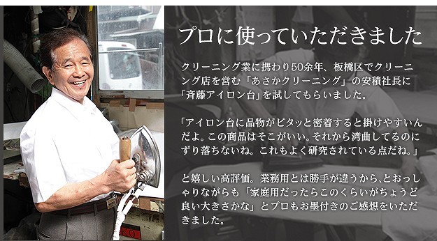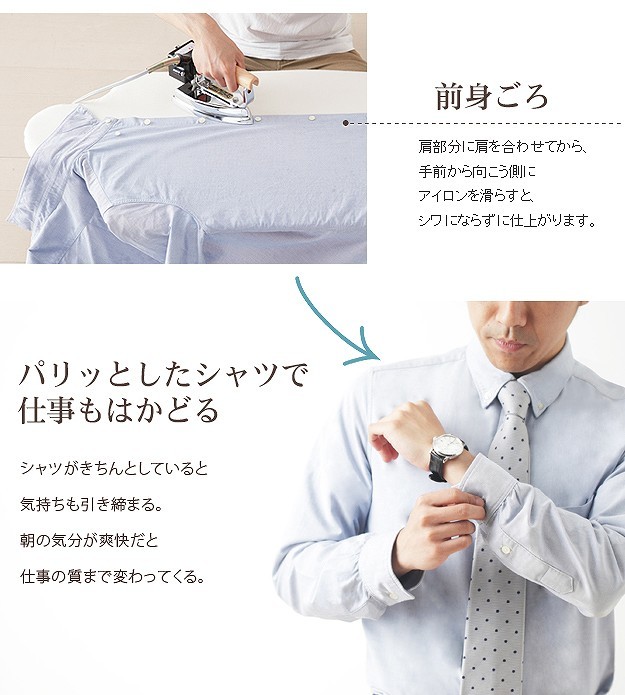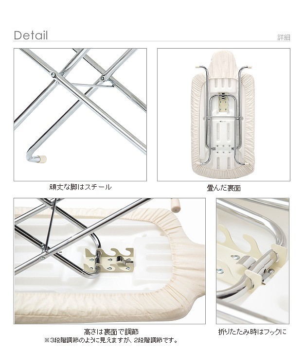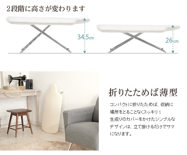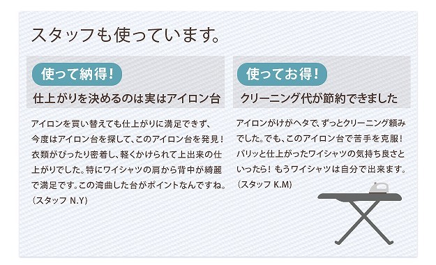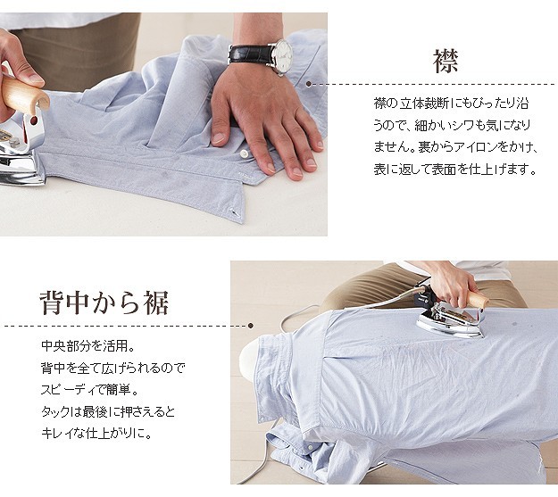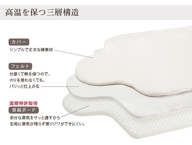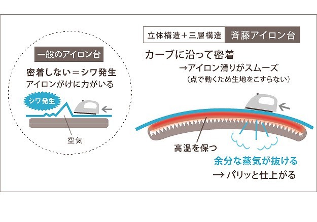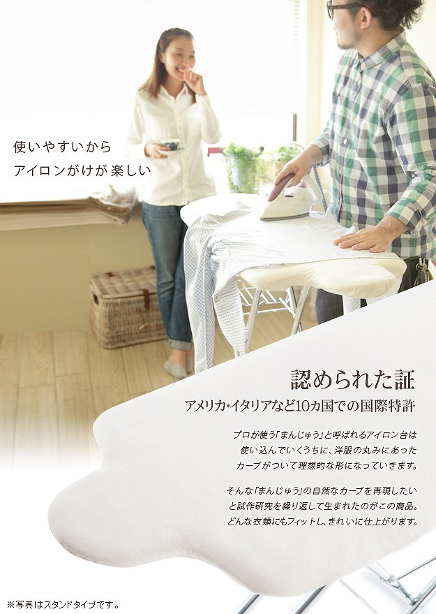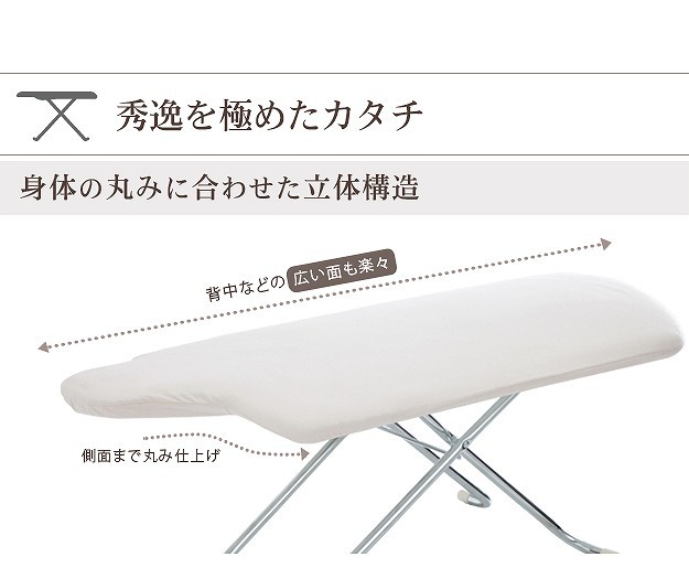 台が湾曲して使いやすい立体アイロン台。丸みを帯びているので衣類との接触面が少なくなり、アイロン滑りが軽く、力を入れずにアイロン掛けができます。42cmのワイド設計で掛け面が広いのも特徴。国際特許のボードの突起構造が、蒸気を逃がし熱気を閉じ込めることによりパリッっとした仕上がりになります。カバーは外してご家庭で洗濯可能です。