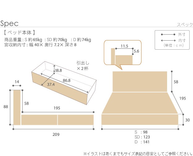 サイズ(cm):幅141x奥行209x高さ88(床板高さ30)cm・約74kg