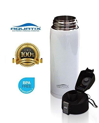 The Aquatix Sporty 21 oz Double Wall Insulated Stainless Steel Water Bottle is perfect for use at the gym, at the office, around your house and anywhere you need to take your beverage of choice with you. Made from durable and sturdy PREMIUM QUALITY, Top Chef 18/8 FOOD GRADE STAINLESS STEEL, this Aquatix Sporty 21 ounce water bottle is a great eco friendly sports bottle. The double wall insulated water bottle is PERFECT for carrying while walking, hiking, camping, use at the gym or just on the go- as it fits MOST car cup holders. No more spills and messes while driving! Ditch those plastic water bottles! GO HEALTHY with this BPA Free, FOOD GRADE stainless steel water bottle that holds a large capacity of liquids 21 fluid ounces and no longer worry about toxins and chemicals leaching into your beverage. Drink crisp, clean, healthy and refreshing drinks from Your Aquatix Water Bottle every time. Just Fill and Go! This sporty bottle features a flip top spout drinking mechanism allows the ease of staying hydrated even while on the go! The flip cap top provides single-handed drinking ability and is perfect for your busy life on the go! Stay hydrated and DRINK MORE WATER with this large capacity 21 ounce water bottle. Double vacuum insulated wall construction contributes to hot teas, soup, coffee or other blends being consistenly hot for up to 12 hours. And, for cold water, smoothies, soft drinks, or anything you may need very cold, 24 hours of insulated confidence, guaranteed cold, period! The bottle will not "sweat", meaning it will not create condensation which may leave a "ring" of liquid on your expensive buried walnut side table. Easy to hand wash or clean, NO aftertaste after cleaning. COLD LIQUIDS or HOT LIQUIDS! This is a double wall insulated water bottle that is made of 18/8 food grade stainless steel water bottle! No other bottle has all the features of our Aquatix Sport Bottle!Feature