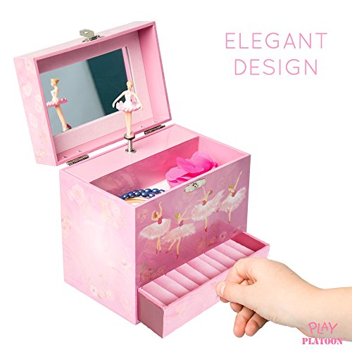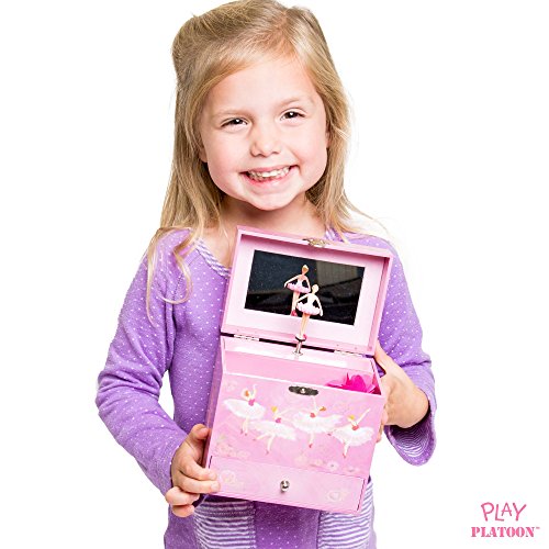 This musical jewelry box featuring a dancing ballerina is the perfect place for storing girl's jewelry or other pressure keepsakes including bracelets, necklaces, earrings, rings, pendants, anklets, and more. Makes a perfect gift! Redesigned as of June 2017 with an even larger main compartment to beautifully display all her jewelry.