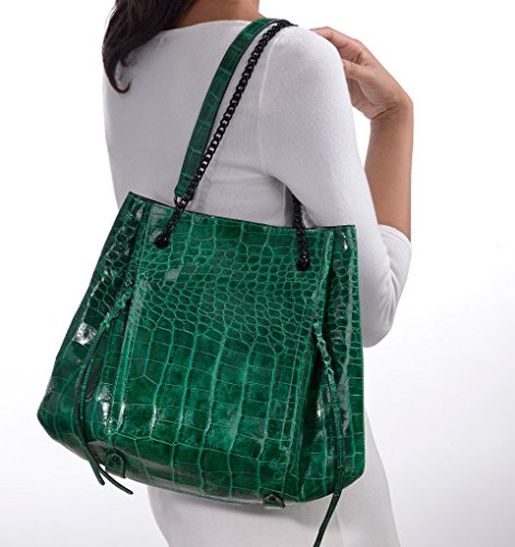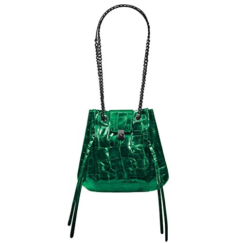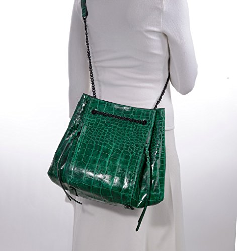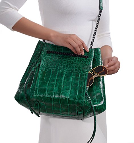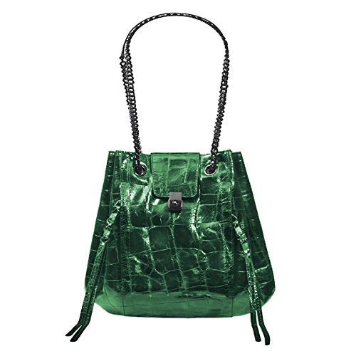 Croc embossed leather bag with top magnet closure merges the chic of a bucket to the practicality of tote. Pull chain accordion construction opens very wide to permit easy access.