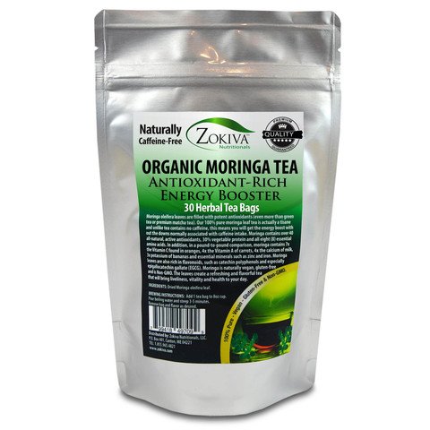 -. Binding : Misc. -. Brand : Zokiva Nutritionals -. EAN : 0799418497099 -. Feature : 100% Pure, Organic, all-natural, potent moringa / Naturally caffeine-free, Non-GMO and Gluten-free / Contains over 90 plant-based vitamins and minerals / Helps to boost and sustain energy levels / Supports weight loss through improved metabolism and digestion -. Label : Zokiva Nutritionals -. LegalDisclaimer : If you are pregnant or breast-feeding you should consult with a doctor before use. If you are on any medications check with your doctor, or pharmacist before taking any supplement.These statements have not been evaluated by the FDA. This product is not intended to diagnose, test, cure or prevent any disease. -. Manufacturer : Zokiva Nutritionals -. Model : ZOKIVA-MORINGA-TEA -. MPN : ZOKIVA-MORINGA-TEA -. PackageQuantity : 24 -. PartNumber : ZOKIVA-MORINGA-TEA -. ProductGroup : Grocery -. ProductTypeName : GROCERY -. Publisher : Zokiva Nutritionals -. Studio : Zokiva Nutritionals -. Title : Moringa Tea Organic 30 Bags 100% Pure Antioxidant-Rich Energy Booster -. UPC : 799418497099