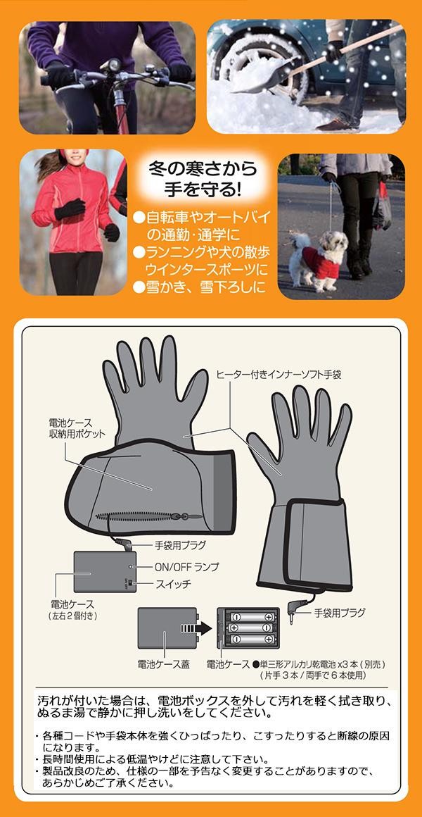 自転車やオートバイの通勤・通学、ランニングや犬の散歩、雪かきの時の寒さから手を守ります。お使いの手袋のインナーとしても使えます。乾電池式です。 |