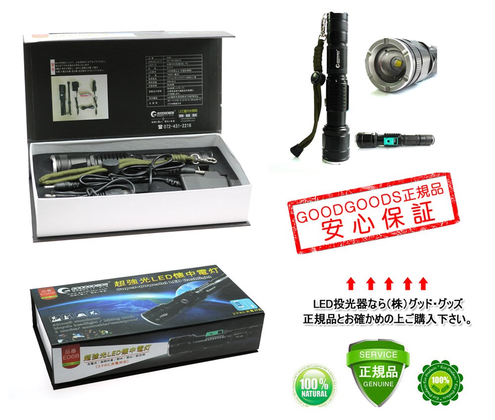 Includes: Light body, Li-ion battery × 1 (18650 type 3.7 V to 4.2 V 3600 mAh), USB charging cord, car charger, AAA battery carrying pedestal, Japanese manual, package
