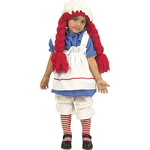 -. Binding : Apparel -. Brand : Charades -. Color : Blue -. Department : girls -. EAN : 0726123001587 -. Feature : Includes dress with apron / Size: Fits 2-4 years old / Hat with attached yarn hair not included / Stockings and shoes not included -. ProductGroup : Toy -. ProductTypeName : ACCESSORY -. Size : 2T-4T -. Title : Child's Toddler Rag Doll Girl Halloween Costume (2-4T) -. UPC : 726123001587