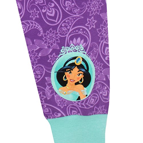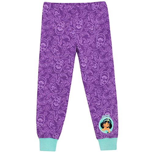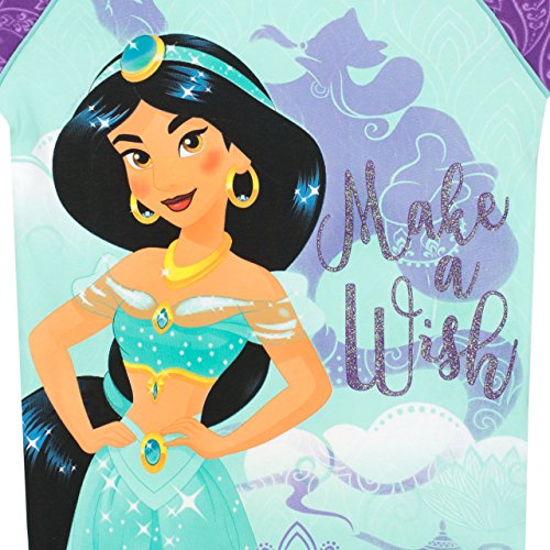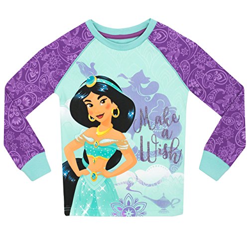 Girls Disney Aladdin pajamas. Take a magic carpet ride towards a magical bedtime in these beautiful pjs! A pretty purple and mint pajama set featuring Disney's Princess Jasmine, as well as the words 'Make a Wish' in glitter against a background print of Aladdin's genie with the magic lamp. Crafted in soft cotton, with an elasticated waist and cuffed ankles for complete comfort!
