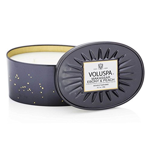 [Product Information]- Voluspa Makassar Ebony & Peach OvalTin Candle starts with scents of warm ebony and rich mahogany that create a smooth sensual base. A lively mirabelle peach and apple blossom add a succulent juice note to round out this unique aroma. A Voluspa Classic since 2006.