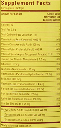 Nature Made Prenatal Multi + DHA combines the key nutrients of a prenatal multivitamin with 200 mg of omega-3 fatty acid DHA into one softgel.