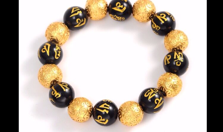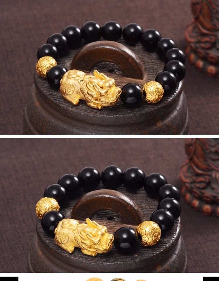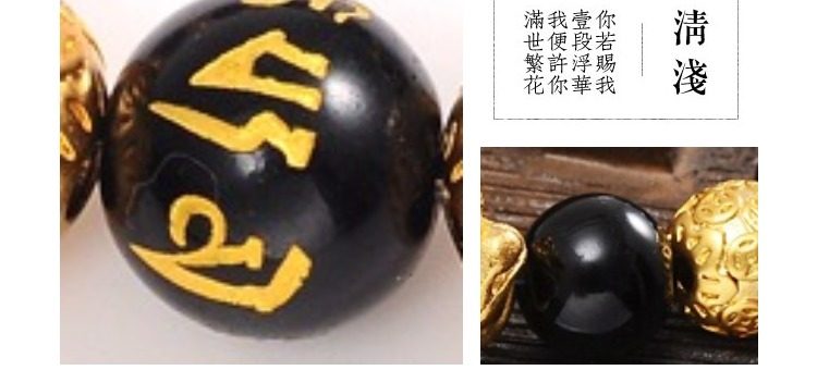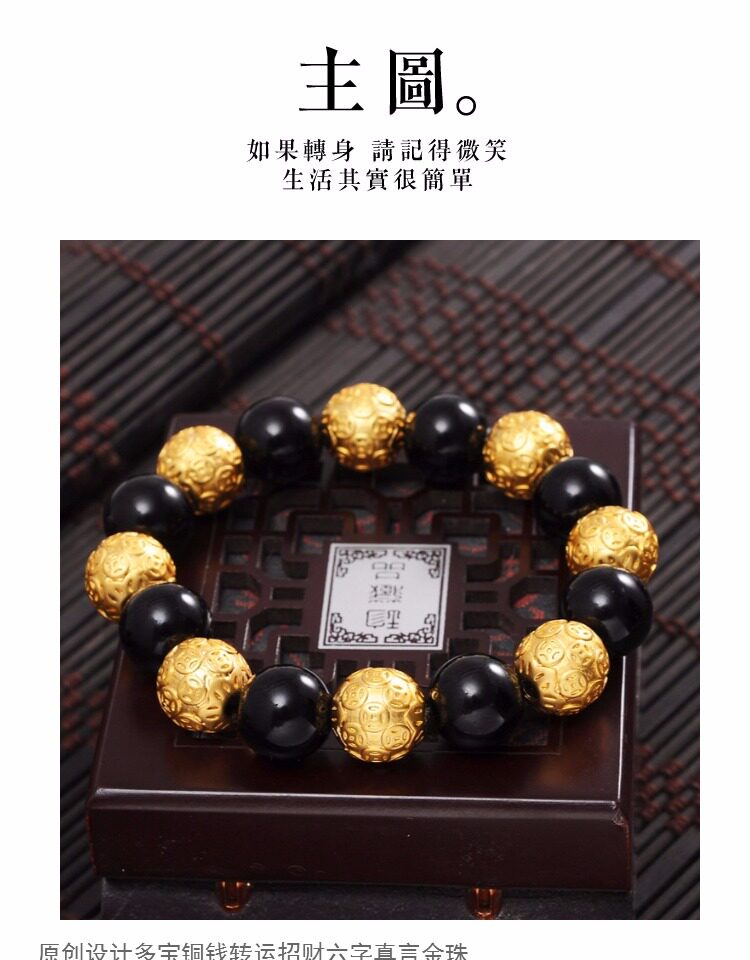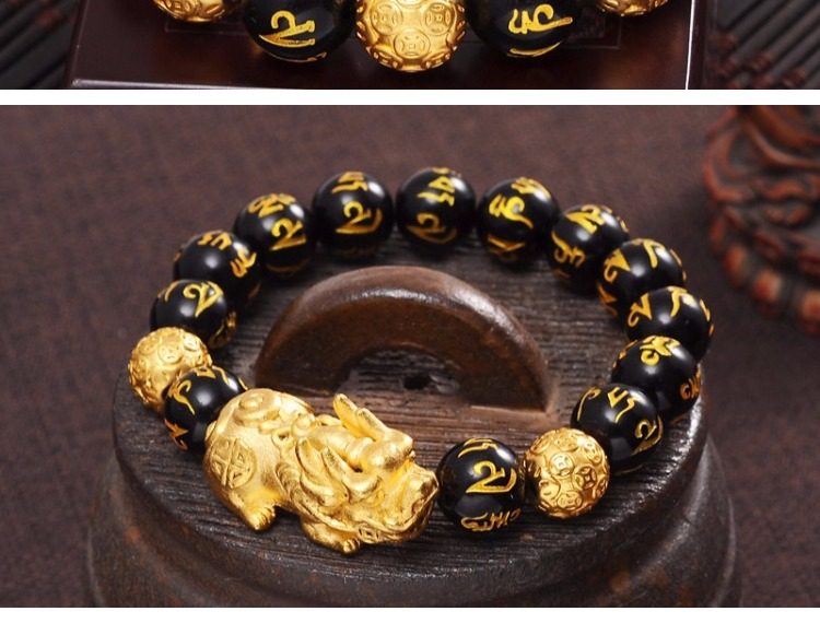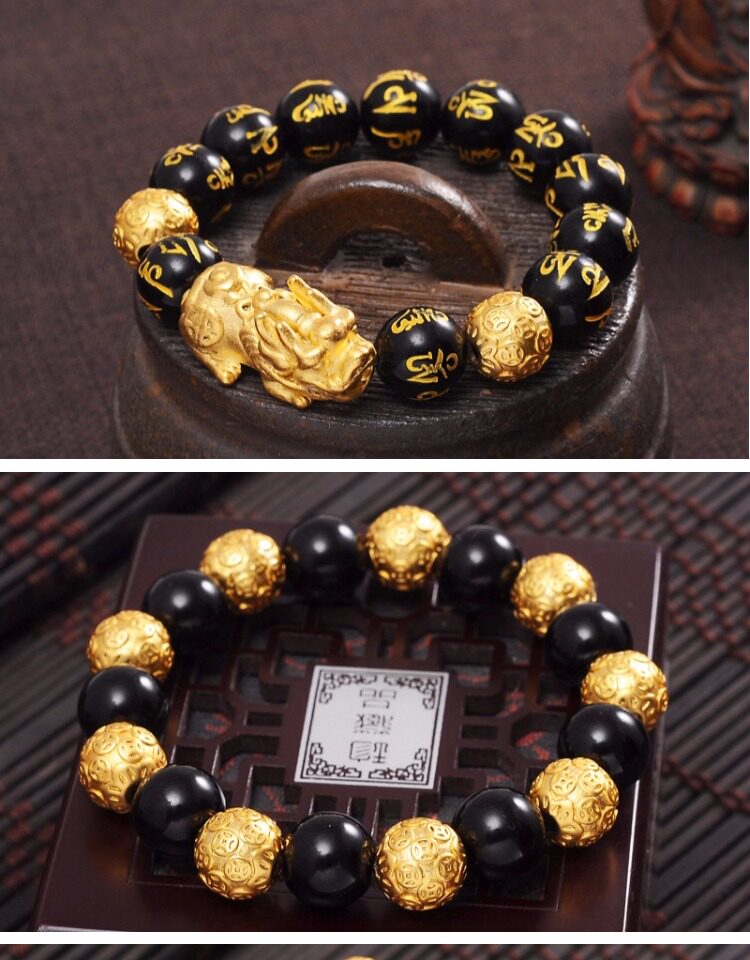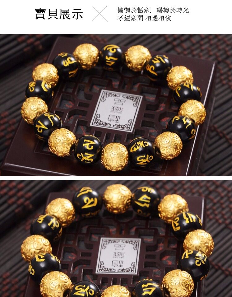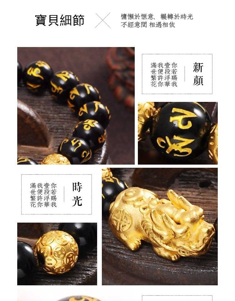 越南镀沙金招财实心貔貅手串男女情侣款六字真言手链黑曜石首饰