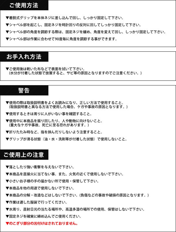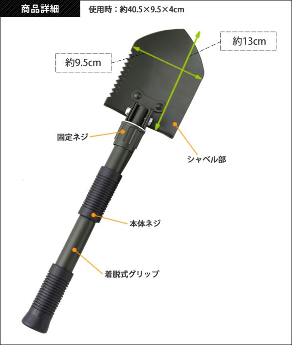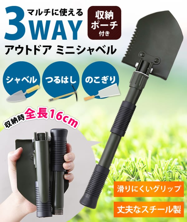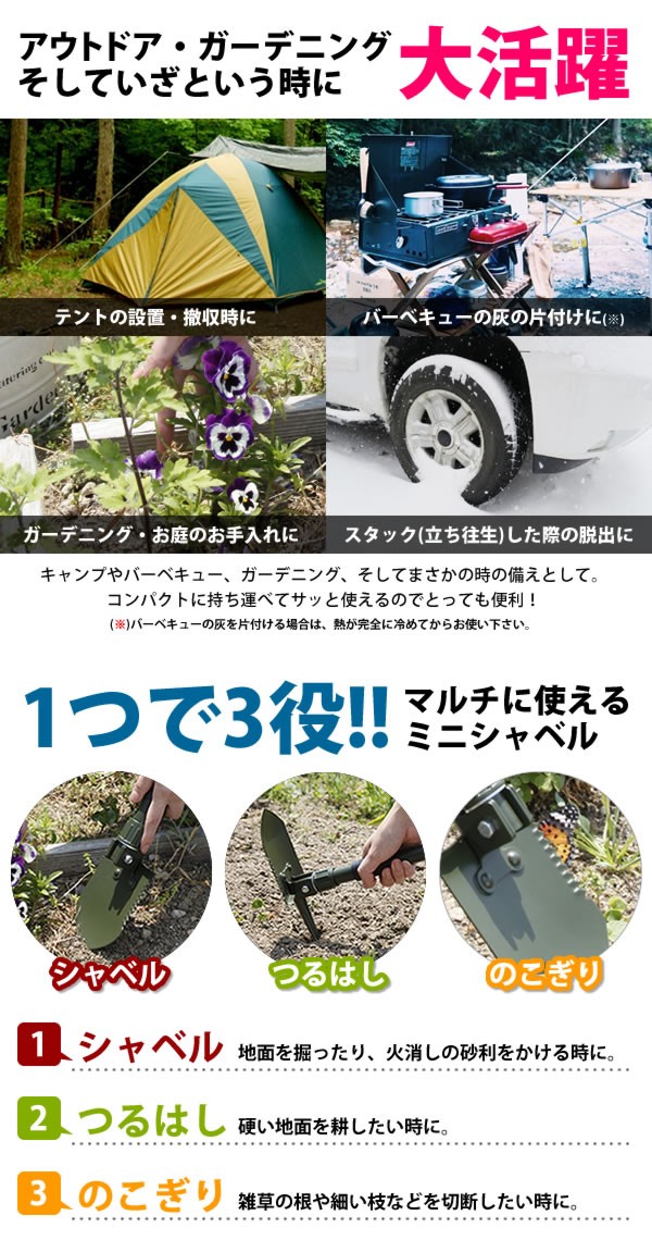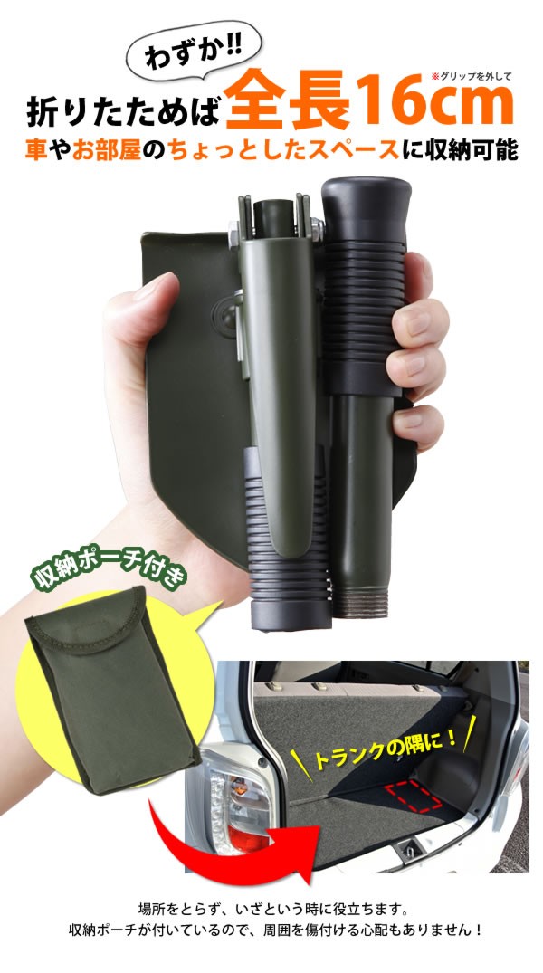 | シャベル・つるはし・のこぎりの3つの機能でいざという時に役立ちます。グリップを外して折りたたむと全長わずか16cmとコンパクトに持ち運べてさっと使えます。車のちょっとした隙間に積んでおけるのでアウトドアにも大活躍!周りを傷付けない収納ポーチ付き。 |