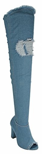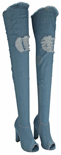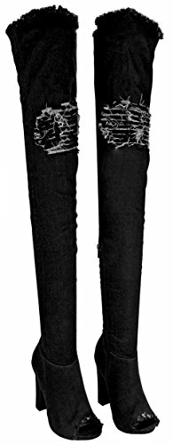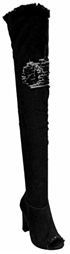Binding : Apparel Product Description Stay stylish and comfortable with these fashion denim boots. Featuring a open toe, stitching details, high chunky heel, frayed holes decor at the top shaft and the upper. Finished with a slightly cushioned insole, a side zipper closure for easy on/off. 0